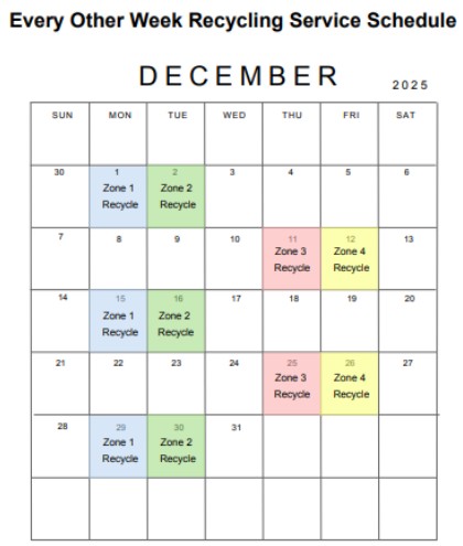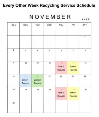 District into four zones, and information detailing solid waste and recycling pick-up schedules for each zone are included in this packet, as well as on the TDS website. Beginning Nov. 6, 2025, BCMUD residents will receive an adjusted pick-up schedule. We strongly encourage District residents to review the information packet and website to identify updated new service days. Please refer to the charts below for a quick look at the adjusted recycling schedules: