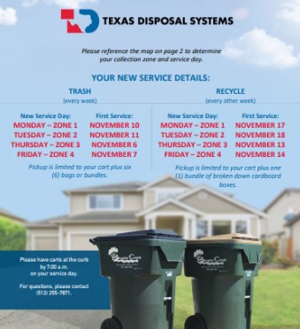 We want to take this opportunity to inform you about changes taking place through our solid waste and recycling collection service provider, Texas Disposal Systems (TDS).