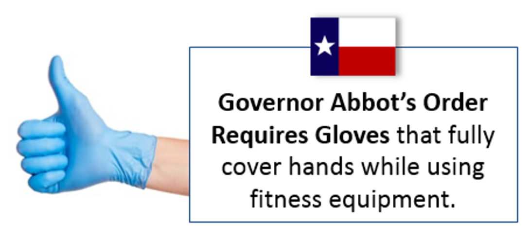 Additional disinfecting will take place every 2 hours with the schedule posted outside each room. Please make sure you bring gloves that cover your full hand if using fitness equipment. See Governor Abbott’s
