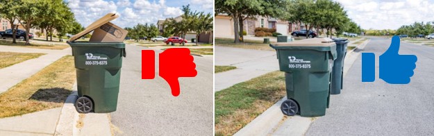 - Customers must place trash carts "wheels-to-curb" with the wheels and handle of the cart facing their home.