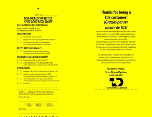 Residents with any questions or concerns should contact Texas Disposal Systems, call 512-255-7871 and select option 2. (Call 512-255-7871, option 5 during holidays and after hours.)
