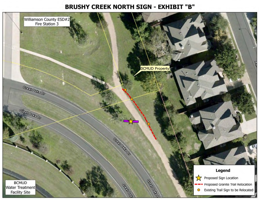 Description: The neighborhood sign previously located at the northwest corner of the intersection of Sam Bass Road and Great Oaks Drive will be replaced and relocated across the street from the BCMUD Water Treatment Facility near the Sam Bass Fire Department facility.