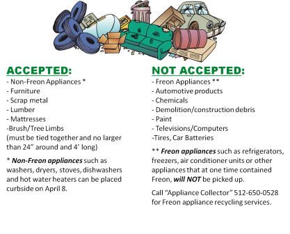 Don't miss this FREE opportunity to get rid of bulk items without the hassle and expense of hauling them off! Please place acceptable items neatly at the curb on April 8 by 7:00 a.m.