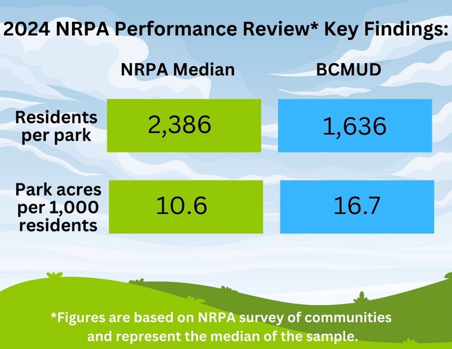 Anecdotal testimony from residents like Zuhse, Hang, and Slusarski is telling, but there is also more quantitative proof to highlight the top-tier status of the BCMUD parks and recreation system. Niemiec cited data from the National Recreation and Park Association (NRPA) showing BCMUD exceeds several other national benchmarks, including: