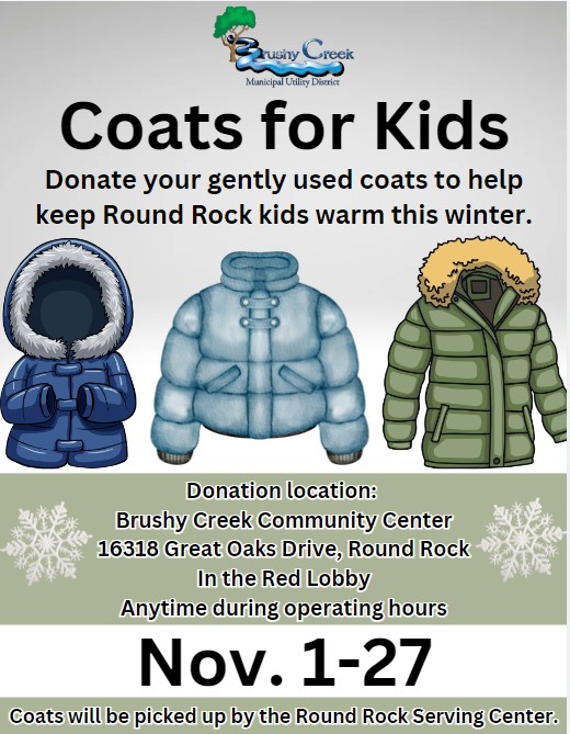 Coats may be dropped off in the Administrative Lobby, and the Round Rock Serving Center will pick up donations periodically throughout the month.