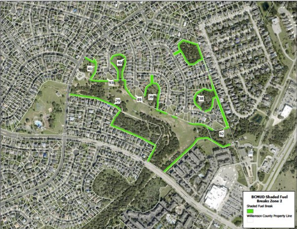 This method is recommended by the Texas Forest Service and involves trimming trees and removing underbrush from a roughly 30-foot-wide strip of land on District property. Specifically, trees or shrubs with a trunk circumference of 1 inch or less will be removed, and those with a trunk circumference of 1 inch or greater will be trimmed. Larger branches that have fallen from trees or that are broken and hanging from trees will also be removed.