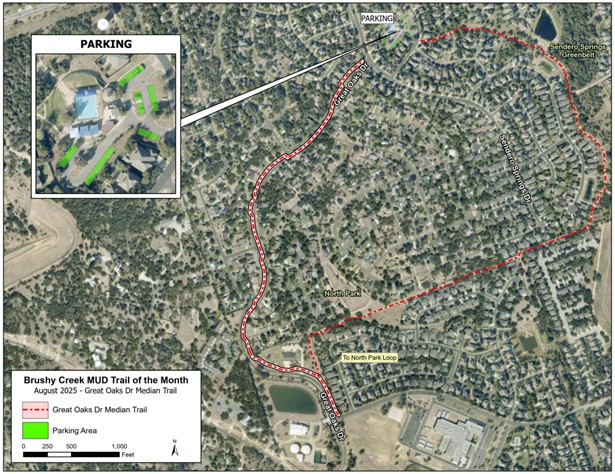 Special features: The Great Oaks Median Trail runs through Great Oaks Drive in the Sendero Springs neighborhood of Brushy Creek MUD. It is unique within the District because it is the only trail on a median in the center of a road. It is a perfect trail to enjoy the residential scenery, and it has access points to several other trails within the Sendero Springs trail network.